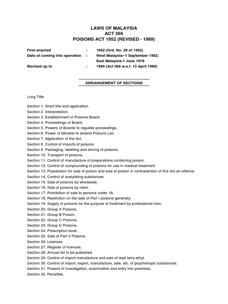 Jadual Pertama Kepada Akta Dadah Berbahaya 1952 Pertama Senarai Racun Kepada Akta Racun 1952 Akta 366 Dan Termasuklah Apa Apa Sediaan Pdf Document