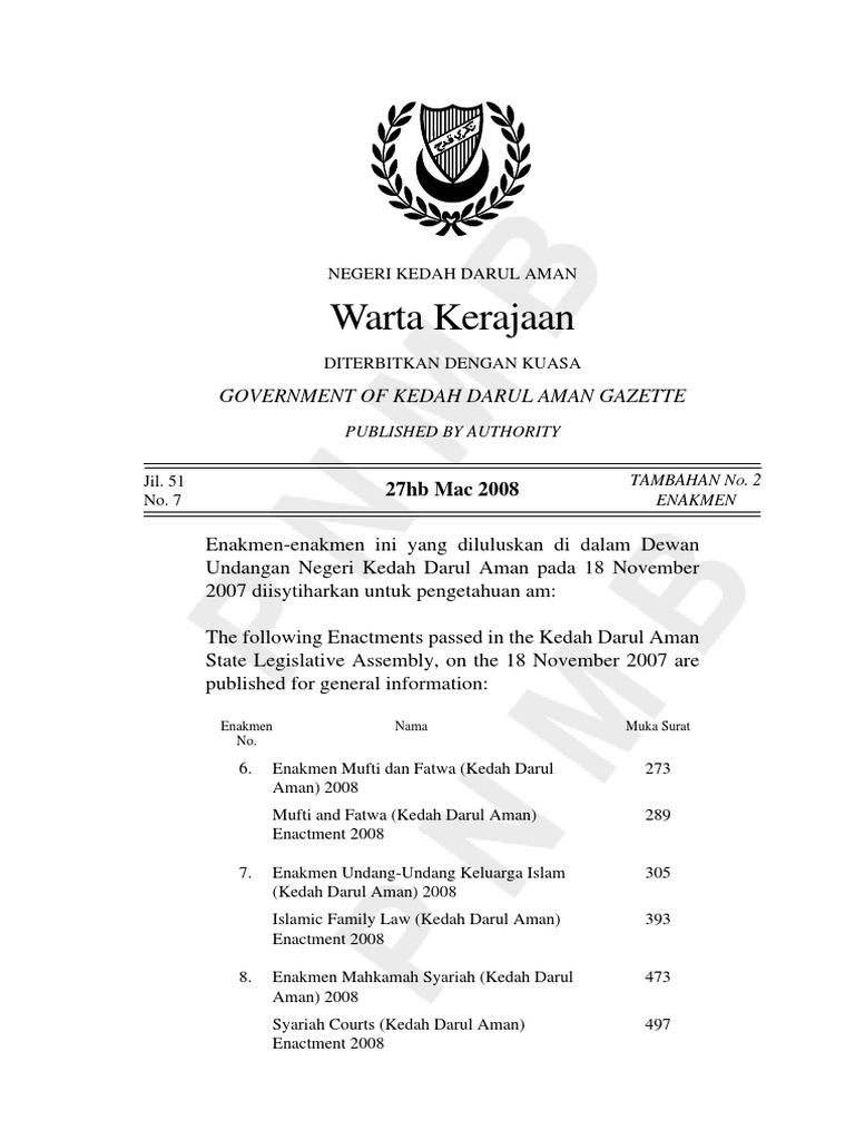 Enakmen undang undang keluarga islam kedah. 11 03 kaedah kaedah a kaedah kaedah undang undang keluarga islam borang dan fee 1988 ns p u. 19 88 original terkini senarai pindaan. Tarikh disiarkan dalam warta. Maka diperbuat undang undang ini oleh majlis undangan negeri kedah darul aman seperti berikut.