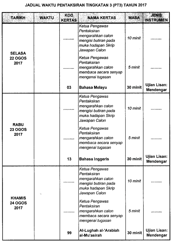 Panduan buat pelajar tingkatan 3 tahun 2017. Jadual waktu rasmi pt3 tahun 2017.