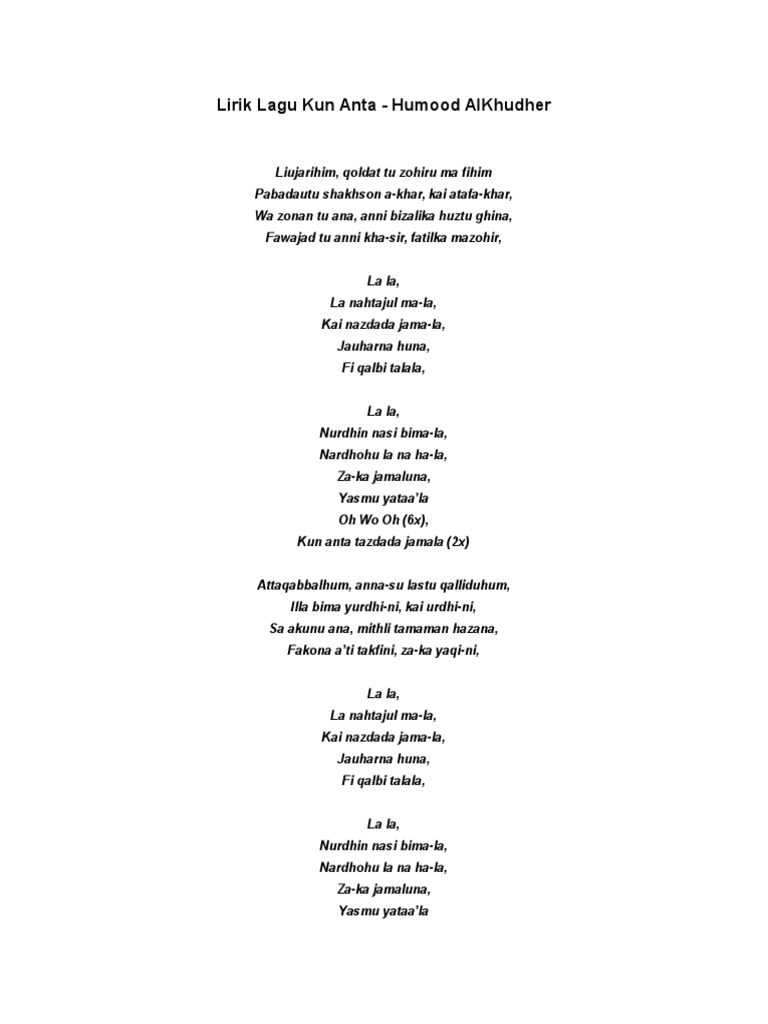 Doc Lirik Lagu Kun Anta Humood Alkhudher Dan Terjemahannya Dung Abdul Academia Edu