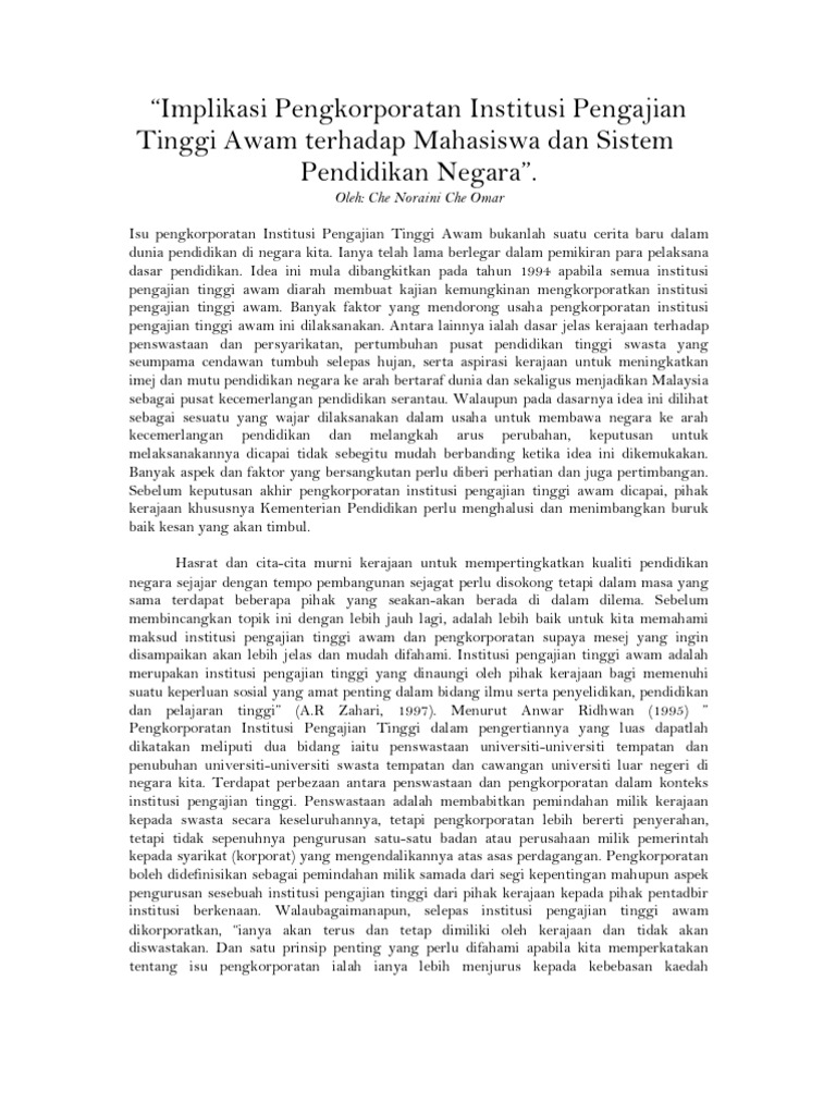 Implikasi Pengkorporatan Institusi Pengajian Tinggi Awam Terhadap Mahasiswa Dan Sistem