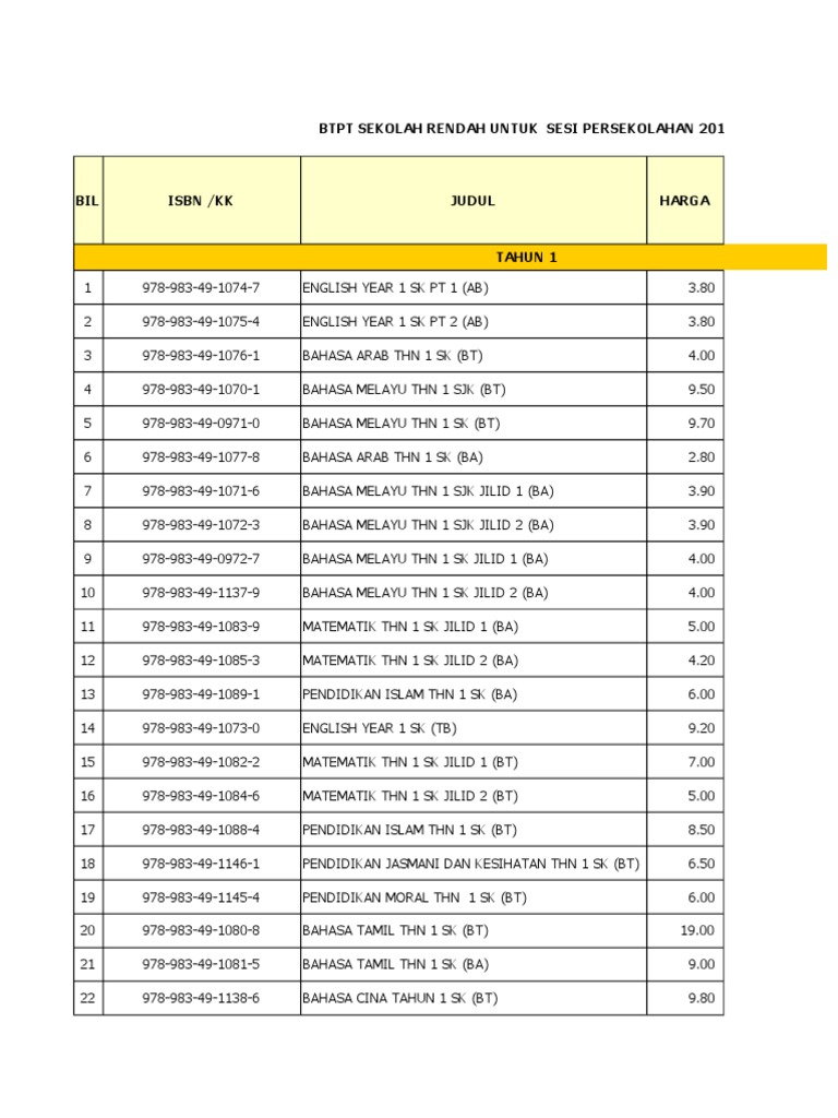 Senarai Harga Buku Tahun 1 5 2015
