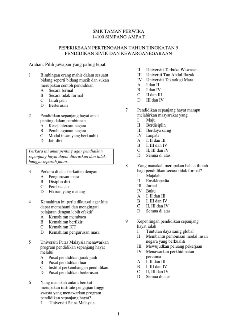Ujian Pertengahan Tahun Pendidikan Sivik Kewarganegaraan Tingkatan 5 Sumber Pendidikan